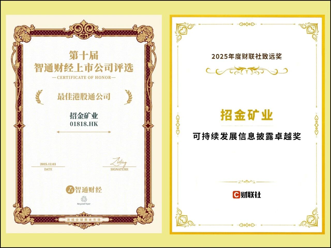 2025年,招金礦業以治理升級夯實發展根基,爲穩健運營與戰略落地築牢保障,榮膺董事會雜志第二十屆中國上市公司董事會“金圓桌獎——董事會價值創造獎”及中國證券報“上市公司(港股)金牛獎——2025年度永續經營金牛獎”,治理水平獲業界認可。在可持續發展領域,公司全面深化ESG實踐,信息披露規範詳實,憑借優異的ESG表現榮獲2025年度财聯社“緻遠獎——可持續發展信息披露卓越獎”,在“格隆彙·金格獎”ESG卓越公司評選中,獲得“ESG可持續發展卓越企業”,樹立了行業可持續發展标杆。在投資者關系管理方面,公司深耕“透明、互信、共赢”的投關生态,高效搭建與資本市場的溝通橋梁,年内股價在多個核心市場指數中表現亮眼,創下曆史新高,市值突破千億大關,獲得證券時報“第十六屆中國上市公司投資者關系天馬獎——港股上市公司投資者關系管理獎”,并在第十屆智通财經上市公司評選中榮獲“最佳港股通公司”殊榮,資本市場影響力持續攀升。财務穩健性與發展潛力同步獲得海内外專業評級機構青睐:中誠信國際維持公司主體信用等級AAA,中誠信亞太将長期信用評級上調至BBBg+,标普全球評級确認“BB+”評級,且均給出穩定展望,進一步鞏固了資本市場融資優勢,爲長遠發展注入強勁動力。