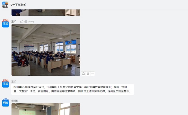 釘釘平台緊“盯”安全生産動态。建立釘釘“安全工作聯系群”,群成員包括經營層、各單位負責人及安全管理員。群内每日普及安全生産法律法規知識、提醒安全注意事項、傳達上級安全生産文件、發布單位安全工作動态、交流安全工作經驗等,以方便安全管理工作人員聯絡溝通。釘釘工作群的上線使用,使各單位開展的安全教育活動、安全工作亮點第一時間在群内“亮相”,營造了崇尚安全、遵守安全的工作氛圍,有效提升了企業本質安全水平。