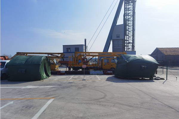 防疫安全有保障。爲保證外來快遞文件接收點快速施工完成并兼顧實用性和耐用性,采用野戰帳篷作爲快遞文件接收點。同時,配備消防沙、消防鍬、消防水桶及2具8KG水基滅火器,移動式紫外線消毒燈1個、床兩張、桌子一張、防疫消殺器具一組,并配備冷藏櫃方便易變質食品的冷藏保存。安裝高清監控攝像頭兩處,同時安裝實時監控系統并與礦山綜合調度中心監控系統聯網。
